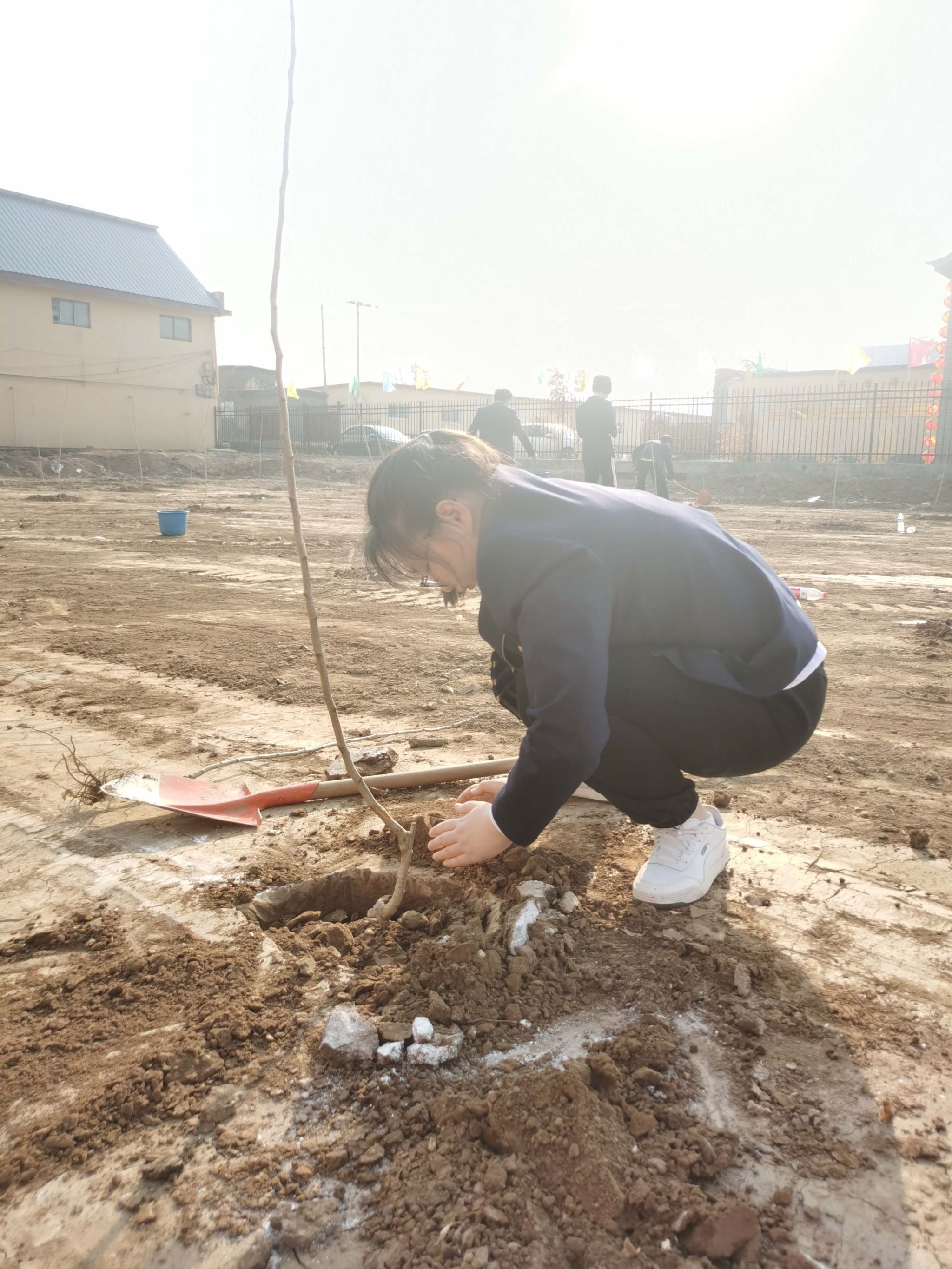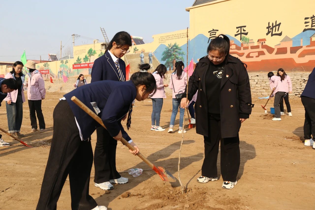 植树现场,同学们热情高涨,干劲十足。他们挥锹铲土、扶苗填坑、踏土夯苗,每一个环节都认真对待,每一棵树苗都寄托着他们的绿色梦想。同学们用自己的行动和汗水增添了一片绿色,充分展现青年学生的良好风貌与责任担当,学会了植树的基本技巧,做到了劳动教育知行合一。